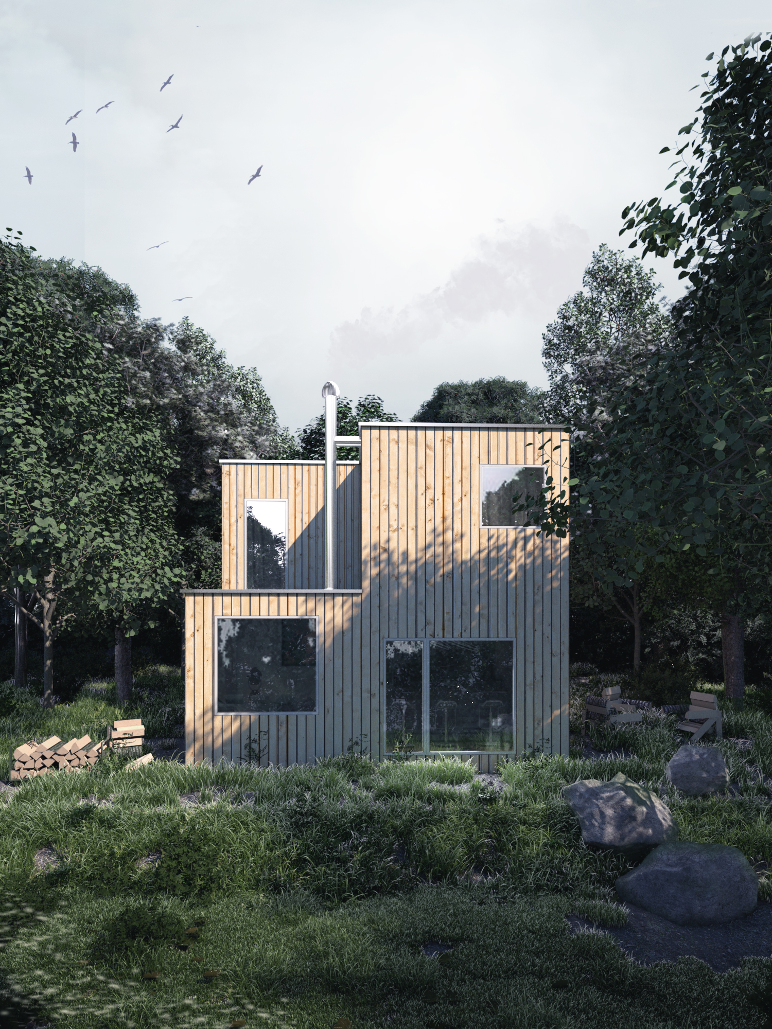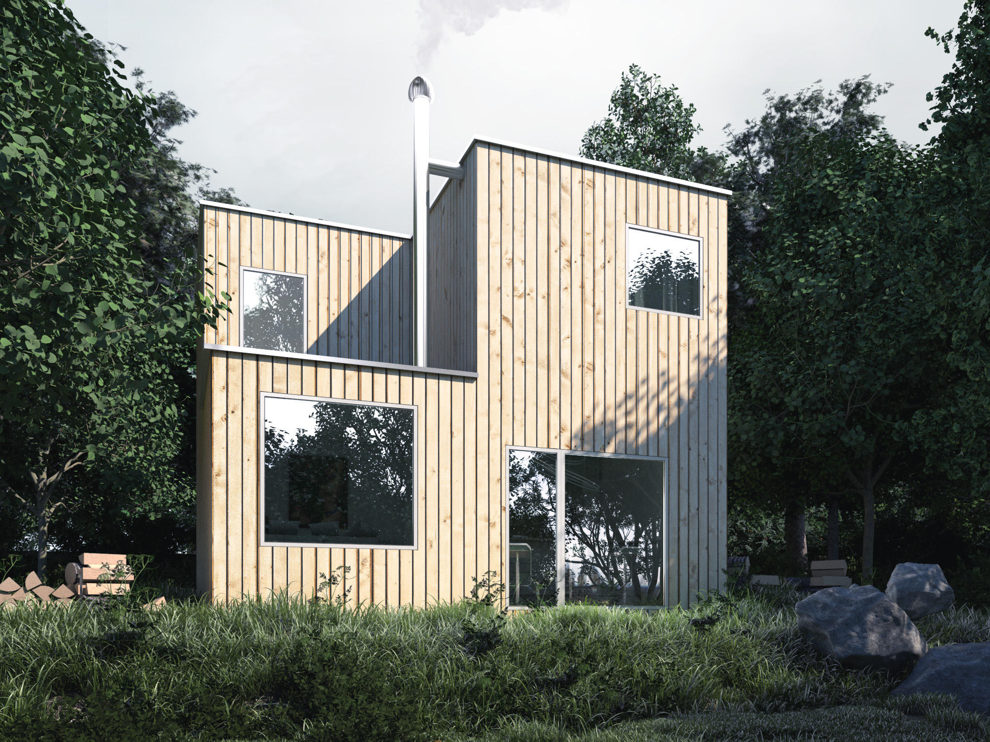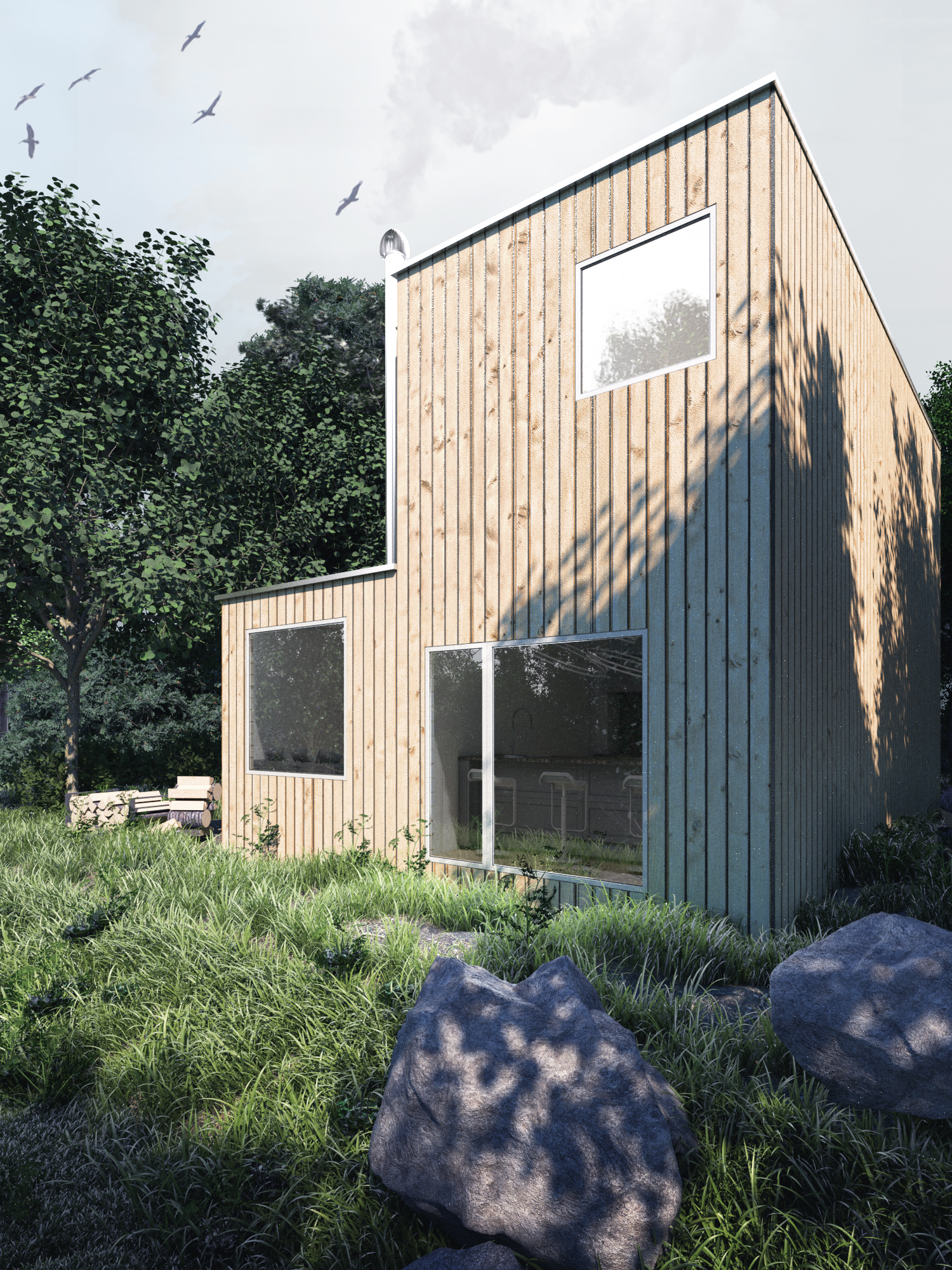 Building visualization of a single-family home, based on D CLAW12 project. Modern buildings from a natural plank.