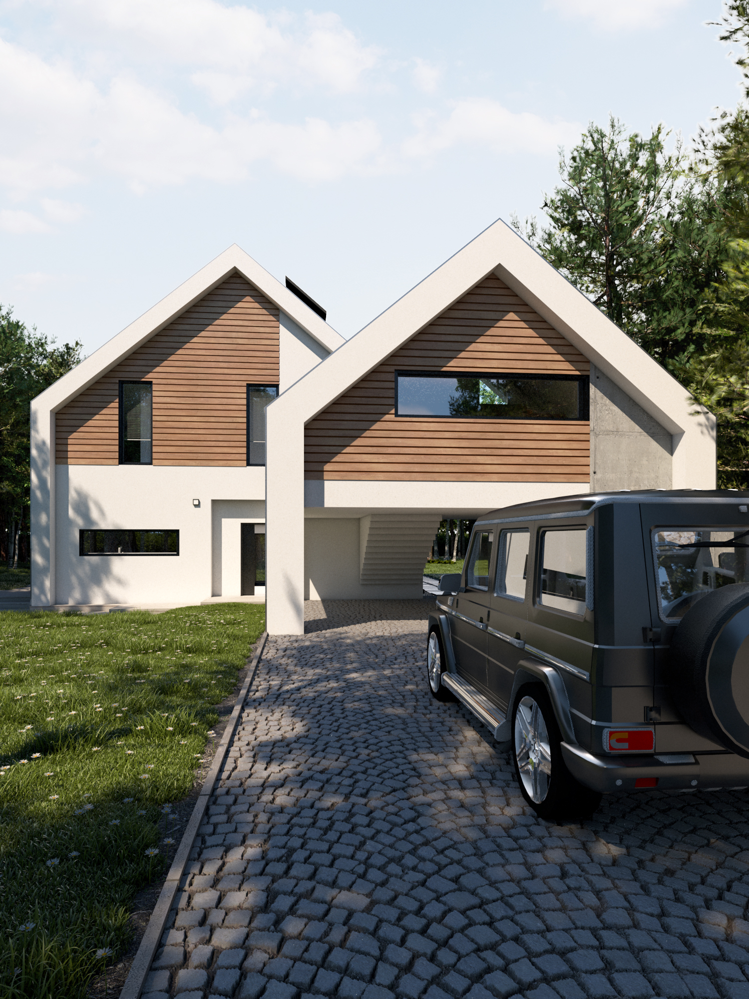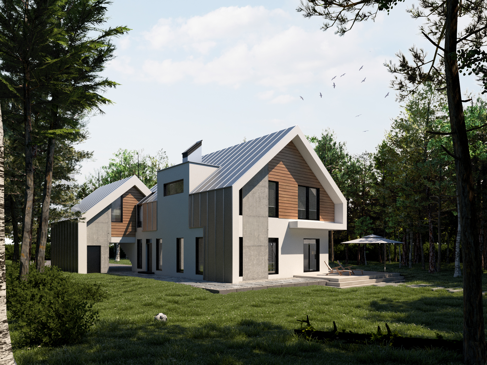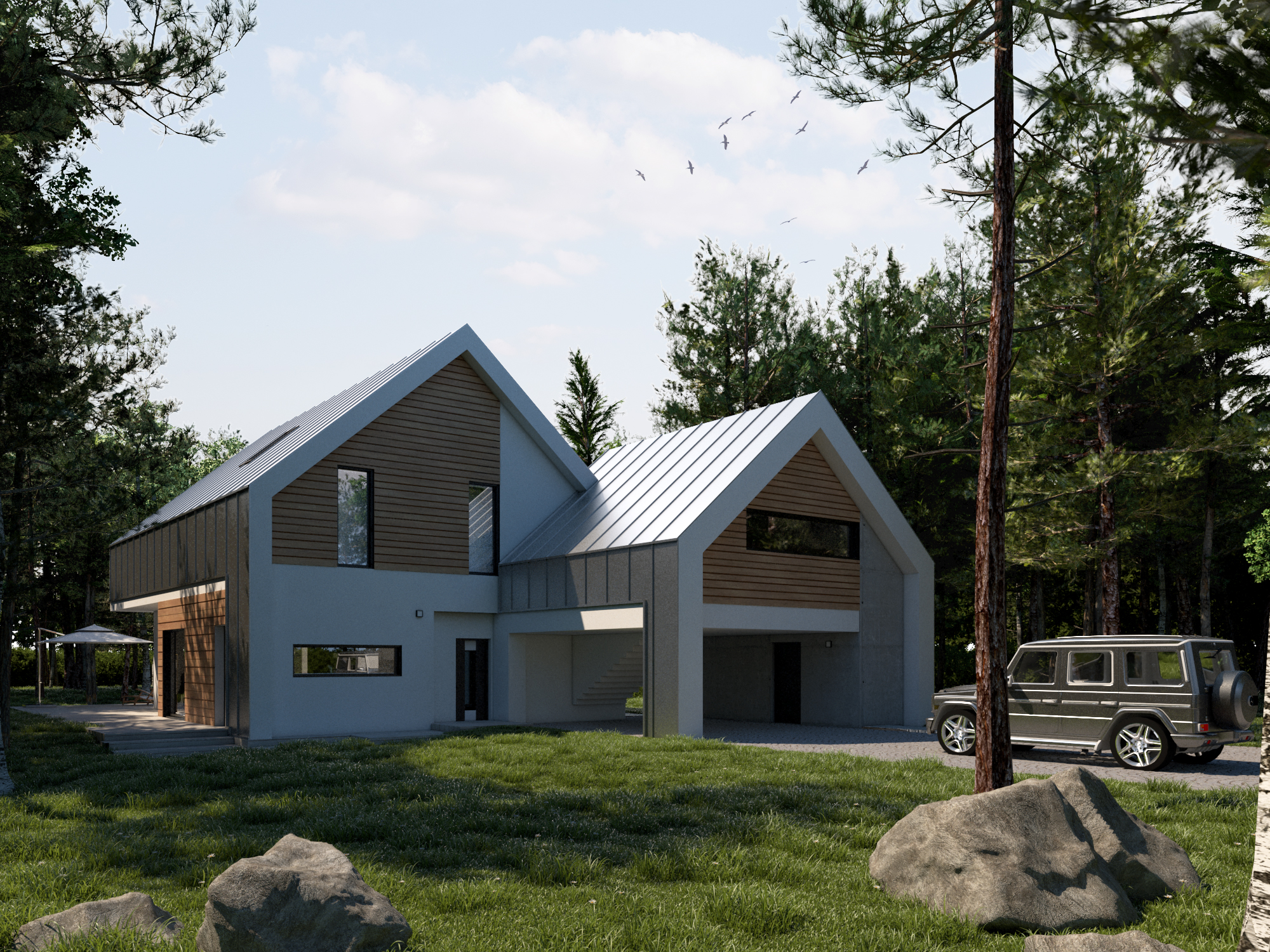 Building visualization of single-family house created in the middle of the forest. Project based on contrast with architecture and nature.