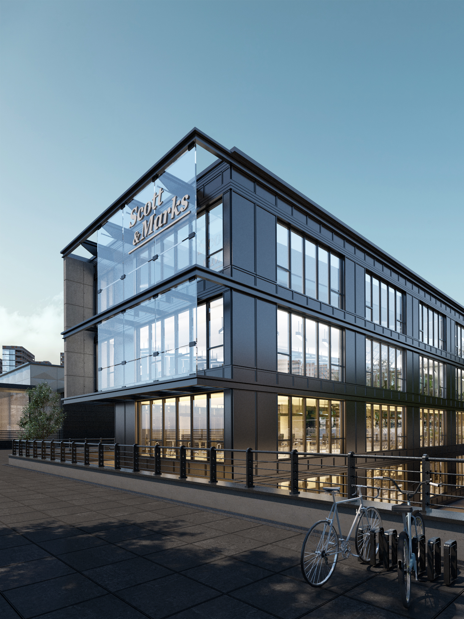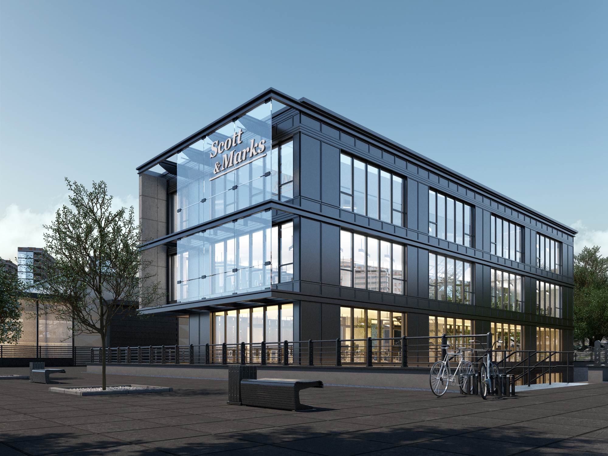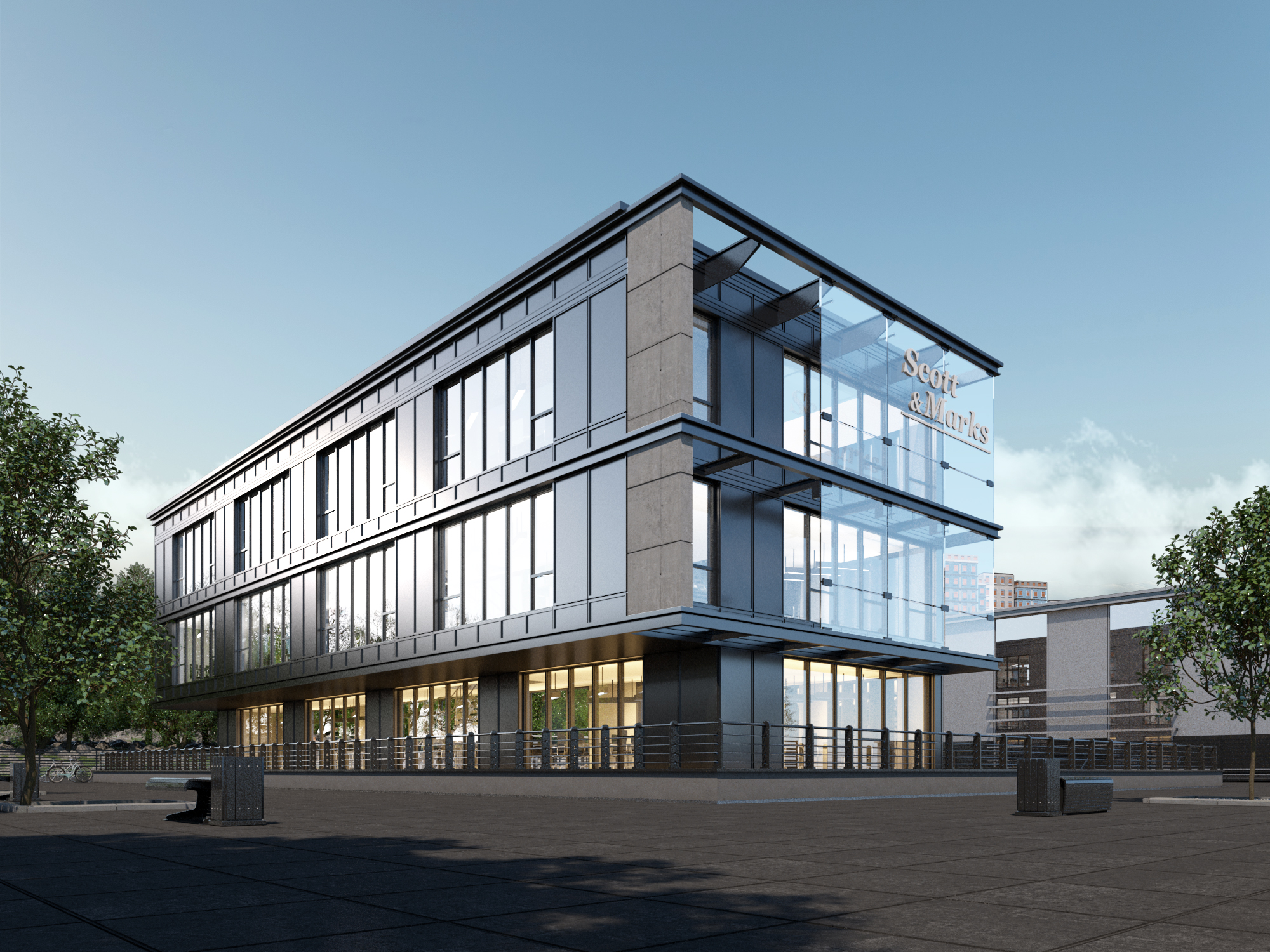 Visualization of modernistic office building inspired by Brahm-Bohomi-Leturia-Bartolome project made for Rollux company.