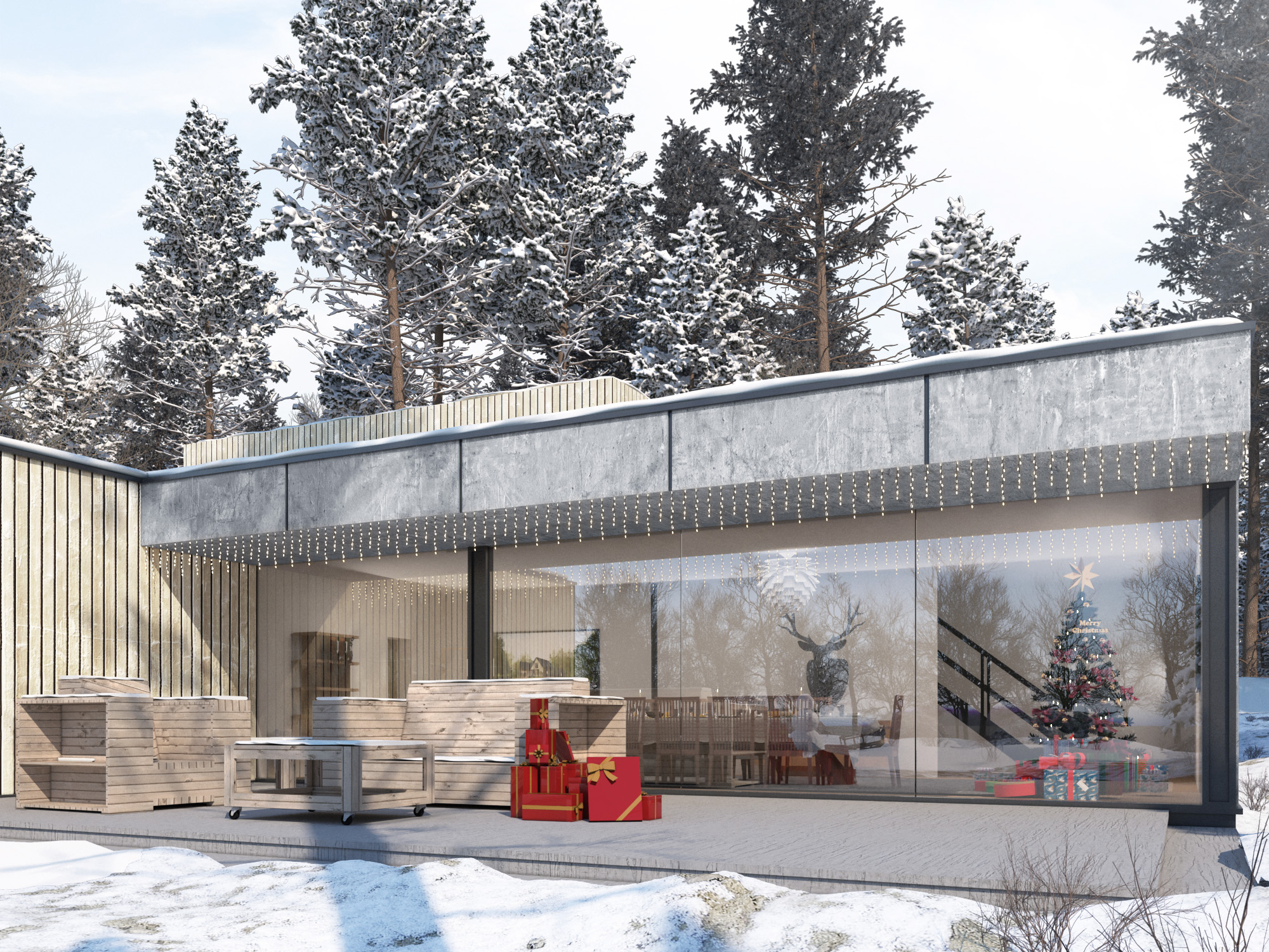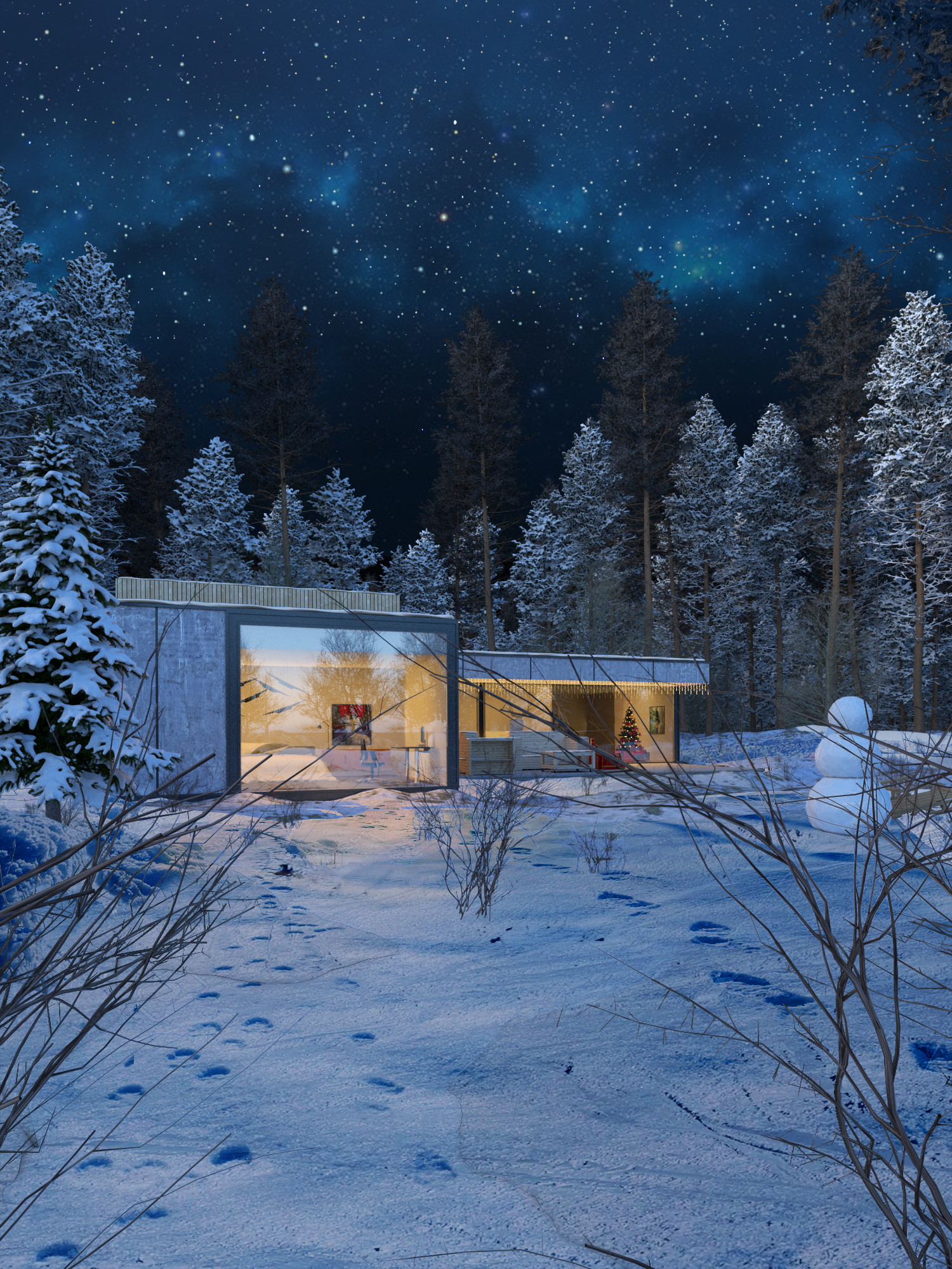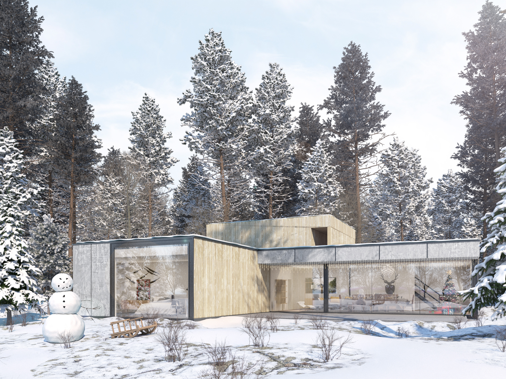 Winter scenery in connection with strict architecture. Compound of monochromatic colors. Shape of the building from Studio De materia.